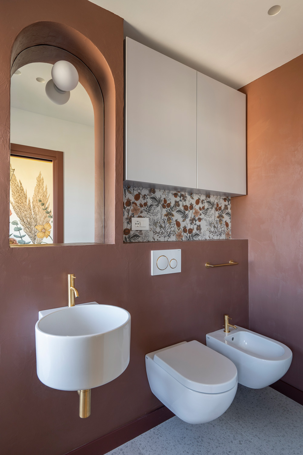 La coppia di coniugi mi aveva contattata per risolvere alcune problematiche del loro appartamento. Entrambi i bagni presentavano il disagio del gradino e la cucina, male organizzata, appariva buia e poco spaziosa. Queste criticità sono state risolte in fase progettuale ridisegnando la distribuzione dei servizi nel bagno e riprogettando la posizione dei moduli della cucina per lasciare libero lo spazio davanti la finestra. Terminata la fase di progettazione architettonica Aurora e Giuseppe si sono lasciati trasportare in una audace personalizzazione degli ambienti che ha interessato l’ingresso, il corridoio, la cucina, la camera da letto padronale con bagno interno e un secondo bagno. Il progetto non ha previsto importanti opere di demolizione in quanto si è deciso di conservare la preesistente distribuzione degli spazi e gli antichi pavimenti in marmo e parquet. La camera da letto è stata caratterizzata dall’utilizzo di una elegante carta da parati del marchio Casamance. La sua funzione di fondale alle spalle del letto dona un forte impatto visivo appena si entra nella stanza. Il motivo vegetale dai colori tenui e naturali composto da rose, papaveri e graminacee su fondo chiaro infonde un’atmosfera bucolica. Il soffitto si tinge di un luminoso giallo per richiamare la palette dei pannelli ed amplificare la sensazione di meraviglia. Il tema romantico prosegue nel bagno interno. Una mattonella grande formato del marchio Abk richiama il motivo e i colori della carta da parati e viene posata all’interno della doccia come fondale del bagno. Le altre pareti sono state impreziosite grazie all’utilizzo di resina color rosso mattone, il colore delle rose, e alla realizzazione di due archi: uno segna l’ingresso in doccia, l’altro fa da cornice allo specchio del lavabo. A terra un pavimento in gres effetto graniglia richiama le atmosfere dei pavimenti in marmo della zona giorno. Il lungo corridoio che porta alla camera da letto padronale utilizza la stessa palette, pareti in giallo, porte e battiscopa laccate color rosso mattone e un imponente arco a circondare ed esaltare l’ingresso della camera. Da una delle altre porte si accede al bagno di casa. Qui il colore delle rose viene scelto per la nuance del pavimento e del rivestimento della doccia in gres grande formato. Il passaggio che fiancheggia la doccia dall’ingresso fino allo spazio dove sono disposti i sanitari e il lavabo è valorizzato da una volta a botte di grande effetto. Il rivestimento utilizzato dietro i sanitari non è da meno: la collezione del marchio Abk «black and shine» esprime in modo originale e anticonformista il tema del lusso con un raffinato bianco e nero arricchito da dettagli brillanti in metallo prezioso. Il resto delle pareti è protetto da resina bianca lucida. L’ampio ingresso di casa raccorda tutti gli ambienti con un effetto boiserie realizzato con una cornice liscia in legno color rosso mattone posizionata a 1 metro da terra, smalto giallo nella parte superiore e blu in quella inferiore. Il blu sorrento è il colore della cucina che si sviluppa su una sola parete a tutta altezza. I moduli alti, più profondi dei pensili, creano un suggestivo effetto ponte sul piano di lavoro in fenix rosso jaipur. Le gole verticali ed orizzontali sono in finitura nera per richiamare il colore del pavimento, una graniglia di marmo nera e grigia dal design attuale. Delle preziose lampade e alcuni pezzi d’arredamento vintage, ai quali i clienti erano molto affezionati, sono stati riutilizzati nel nuovo contesto contemporaneo acquisendo nuova vita.